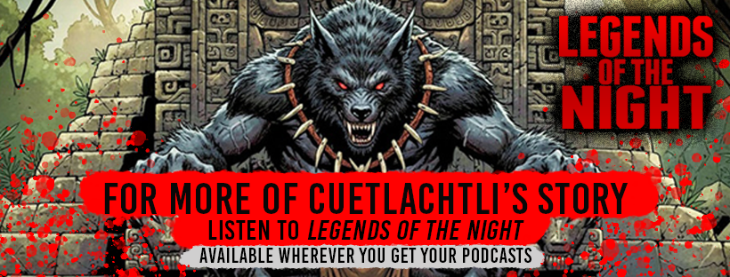 “The Legend of the Tlatoani Mocuitlachnehnequi is one of the oldest in the Aztec lore. Told of a mysterious man known only as Cuetlachtli, which translates among the people to “Wolf”. Cuetlachtli appeared one day in the northeast city of El Tajín. He stood in the city center and declared himself the new king, and that any and all who opposed his self-appointage may step forward and challenge him for the right to lead the people. El Tajín’s own King Milintica, the third son of Mixcoatl and leader of the cult of Quetzalcoatl, came forth. King Milintica called upon the “feathered serpent” to smite the stranger, but Cuetlachtli transformed into a wolf and man, killing King Milinitca and claiming the throne. So began the rule of Cuetlachtli, the Tlatoani Mocuitlachnehnequi. He was said to have come from the north, from Aztlán, the ancestral home of the Nahua. He was many centuries old, said to have been born atop a great mound. His ancestors were hunters, walking as man, becoming wolves as the sun set. The powers he possessed were unlike all seen before. No sorcerer, his equal and no warrior his superior. His followers were given his blood to make them walking wolves. It was an honor bestowed on those who could prove their worth. The reign of Tlatoani Mocuitlachnehnequi lasted many years. Gaining enemies from villages near and far, as his army feared no fight. The tribe would savagely enter neighboring cities as wolves and slaughter citizens where they slept. They wanted not power, but what they sought was blood, consuming it till their bellies full.