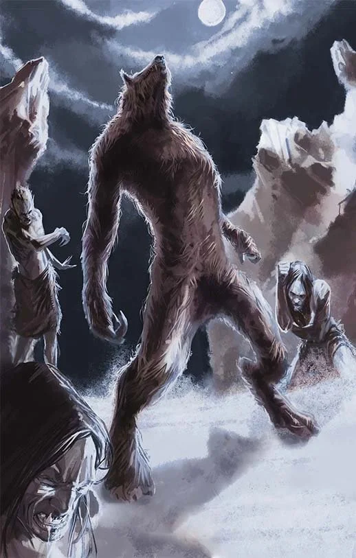 Uncontrollably, each member of the group transformed under the light of the moon, taking on characteristics of the wolf, sprouting hair, fangs, massive claws, driven by an insatiable appetite for the blood of a fresh kill.