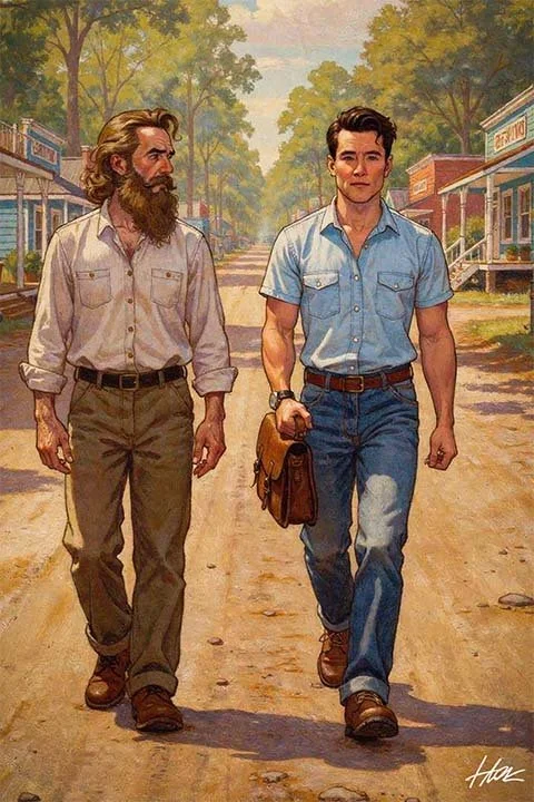 Two men, walked the center of the quiet town. Jones, he’s grizzled with a long beard, and cautious eyes. With him was Uti, Native American, clean cut, carrying a weathered satchel close to his side.