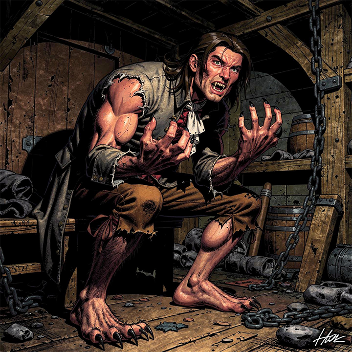 One night, he could hold it back no longer, uncontrollably shifting. The vicious beast killed all of the other prisoners in the hold, nearly one-hundred in all.