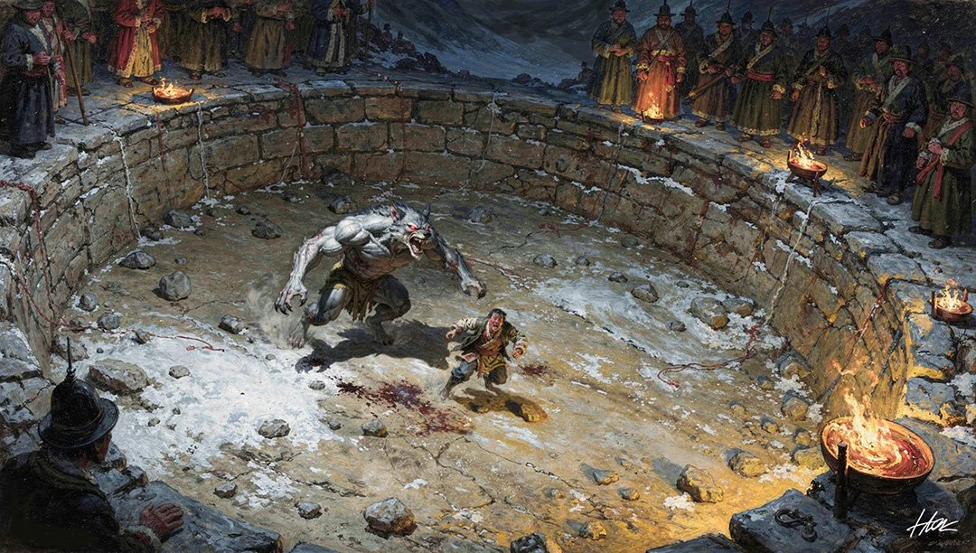 The carnival of slaughter gave way to the pageantry of combat. At first, predatory animals were his contenders. But Sam tore through them with ease. And so, Kishor reached for the only thing he believed might challenge the monster -- Yetis.