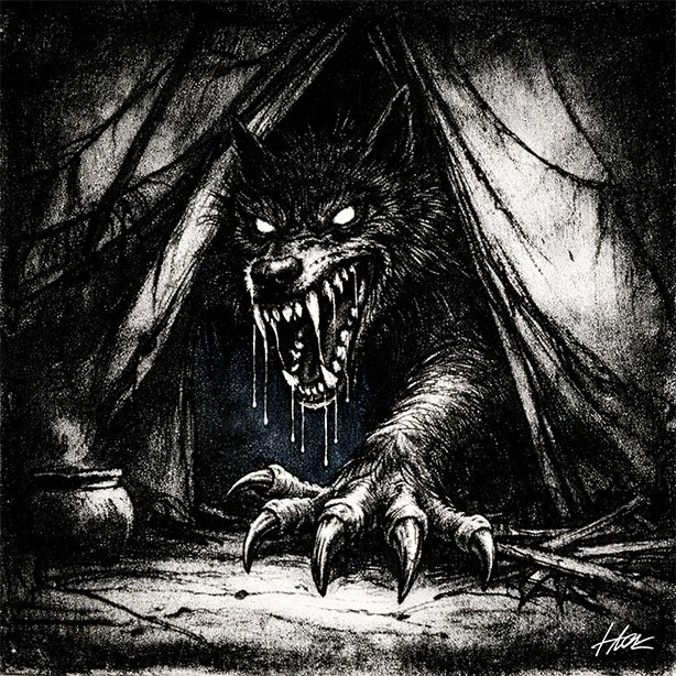 The chieftain, dark as night in his wolf form, saw movement from the shelter. He entered through the opening, ready to make a meal of the boy. But as Ka’waska begged to be spared, the dark one leaned close, and in a booming voice, spoke...