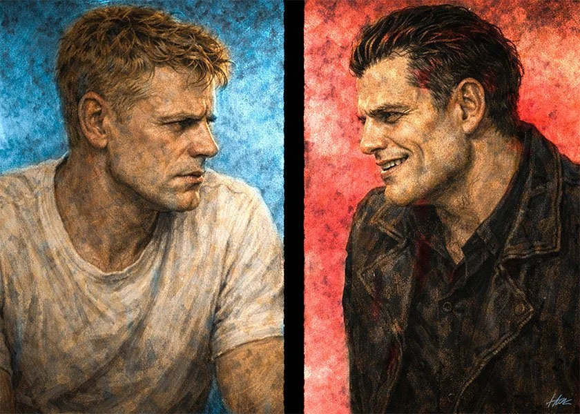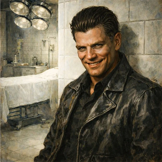 In the hospital, throughout the trauma, Crowley began seeing something strange -- a vision of himself he’d come to know as Fenrir. It was an auditory hallucination. Fenrir’s appearance was that of himself, but a darker complexion, hair and eyes, sharp K-9 teeth. Crowley first noticed him as doctors were assessing his wounds as he arrived to the Trauma Unit. Fenrir stood out from the white-clad Doctors and Nurses, and of course, no one else could see him but Crowley.